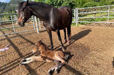Poulinière pleine de l'étalon RAMOND LA VERCHERE. Poulinage estimé le 05/05/2026
