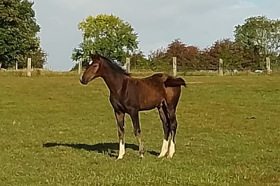 : Foal Selle Français d’un an, par Daguet du Rochau (propre frère d’Eritière d’Estel). Bai brun, bien fait, avec de belles allures. Gentil, calme, proche de l’homme et facile au quotidien.