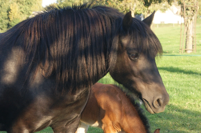 Poulinière pleine de l'étalon Rumach Helzapoppin. Poulinage estimé le 30/05/2026