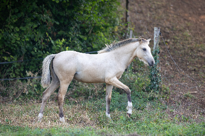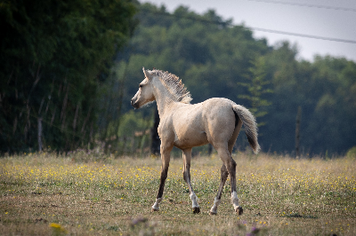 Points forts : Superbe pouliche 2025, sera taille D. Très rare robe Isabelle + Dun, liste en tête et 4 balzanes blanches, pétrie de chic. Excellente locomotion avec 3 belles allures, proche de l'homme, déjà pratique